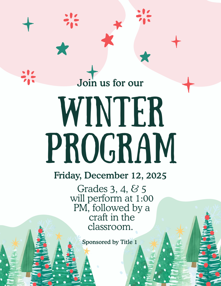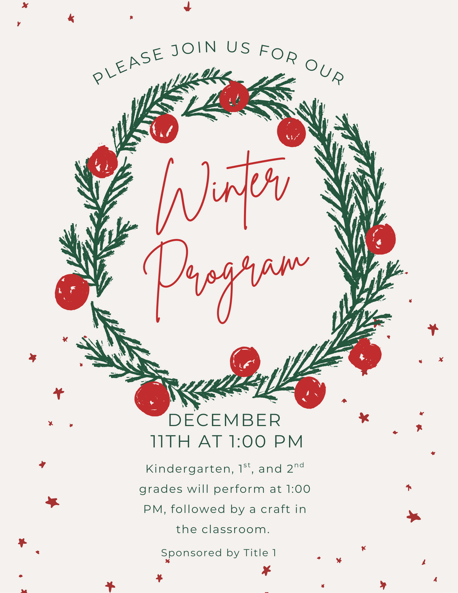 The Winter Program for K, 1, & 2 will be Thursday, December 11 at 1.